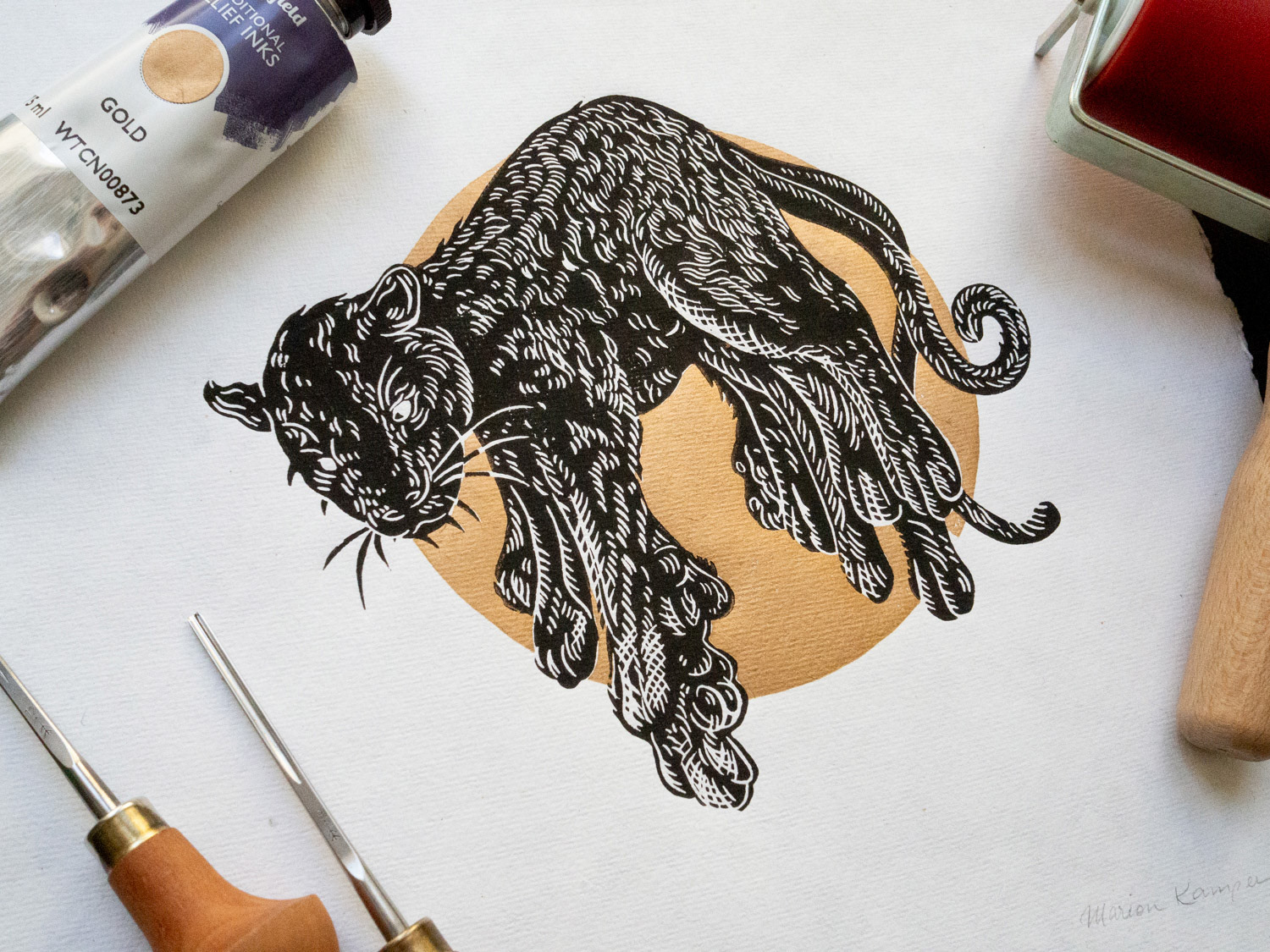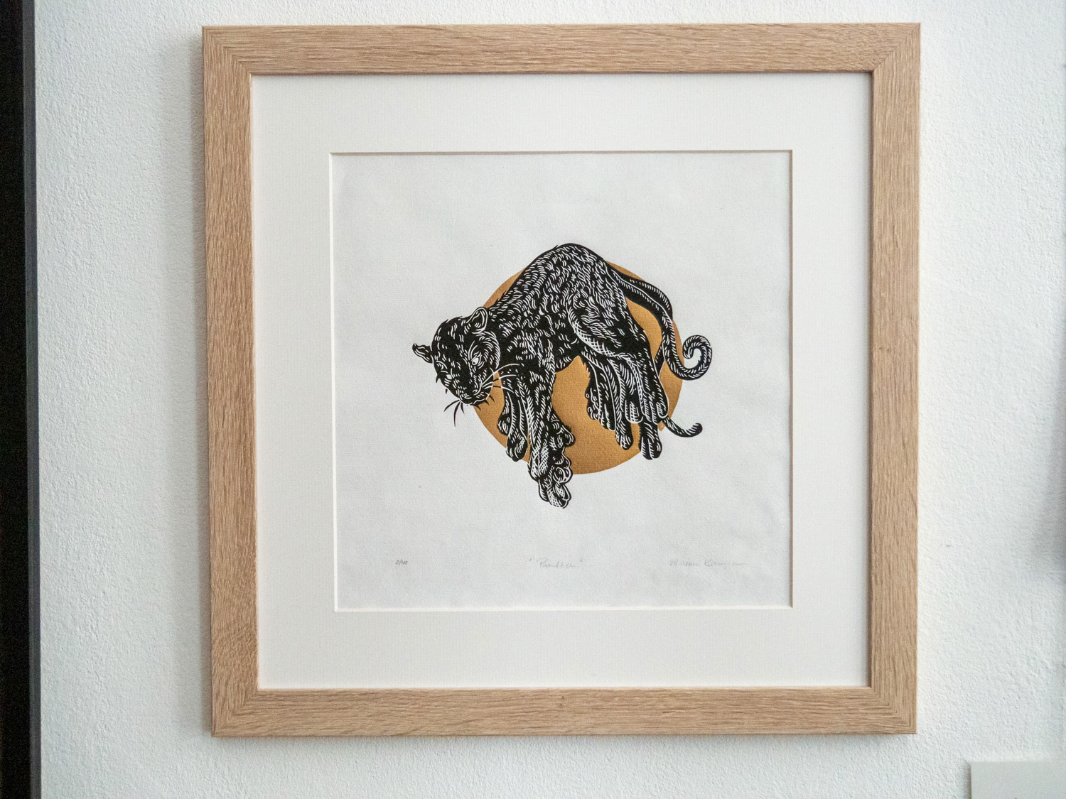 At first the panther was etched onto Clayboard, then finished digitally. There is also a limited edition Linocut version of this panther available in