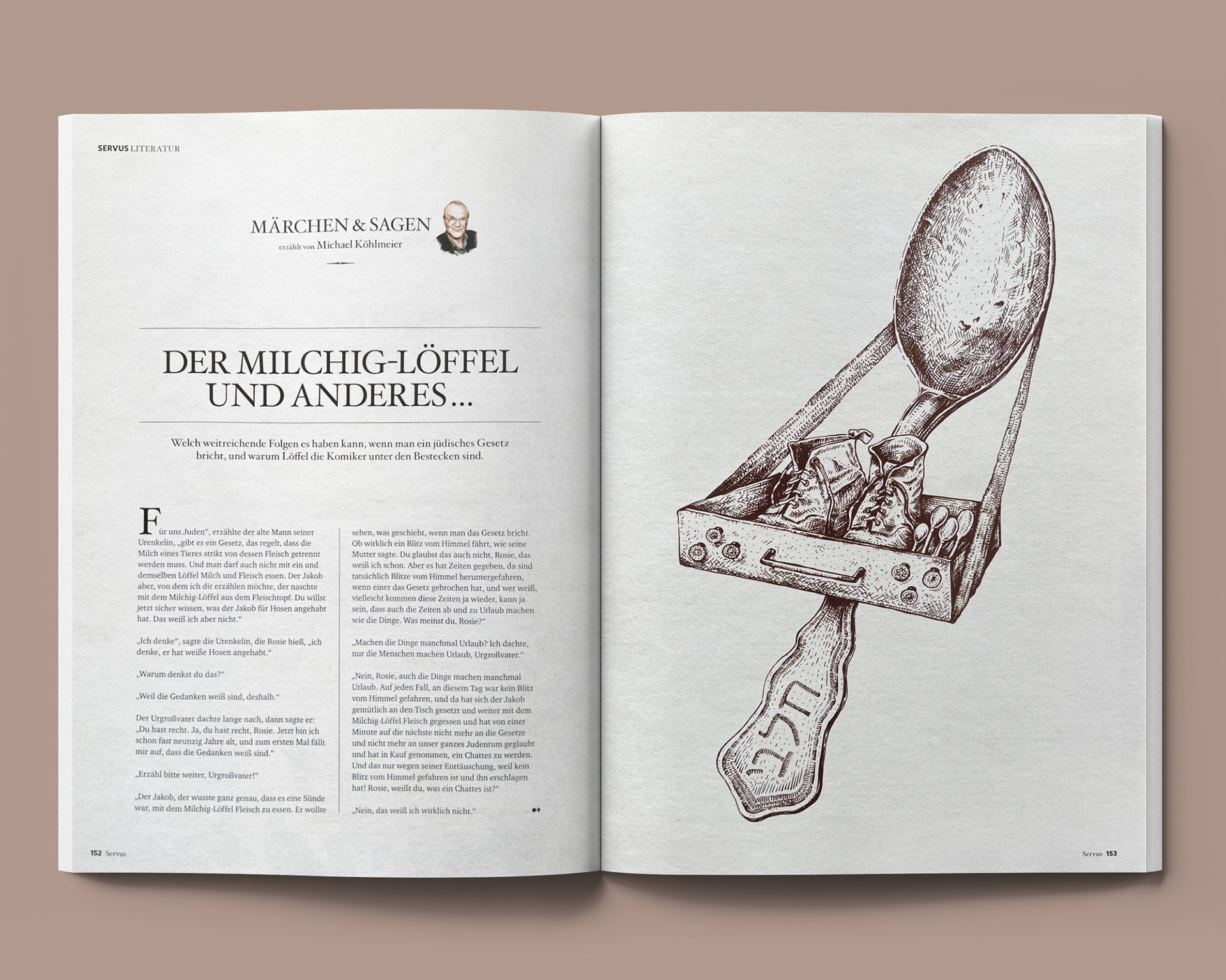 The story is about a "milchig" spoon used for dairy in a jewish household. After being used by a careless kid for eating meat, the father brings it to a synagoge where it gets lost and ends up in the belongings of a hawker (Hausierer) who's shoes give him great pain. In the end, the milchig spoon ends up in a drawer with other cutlery.
