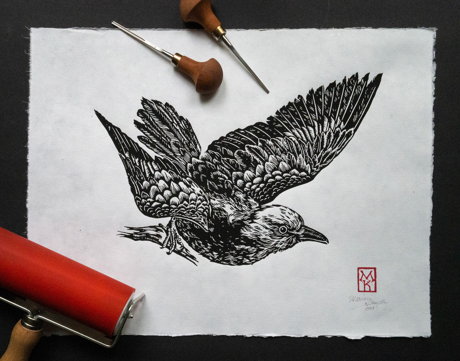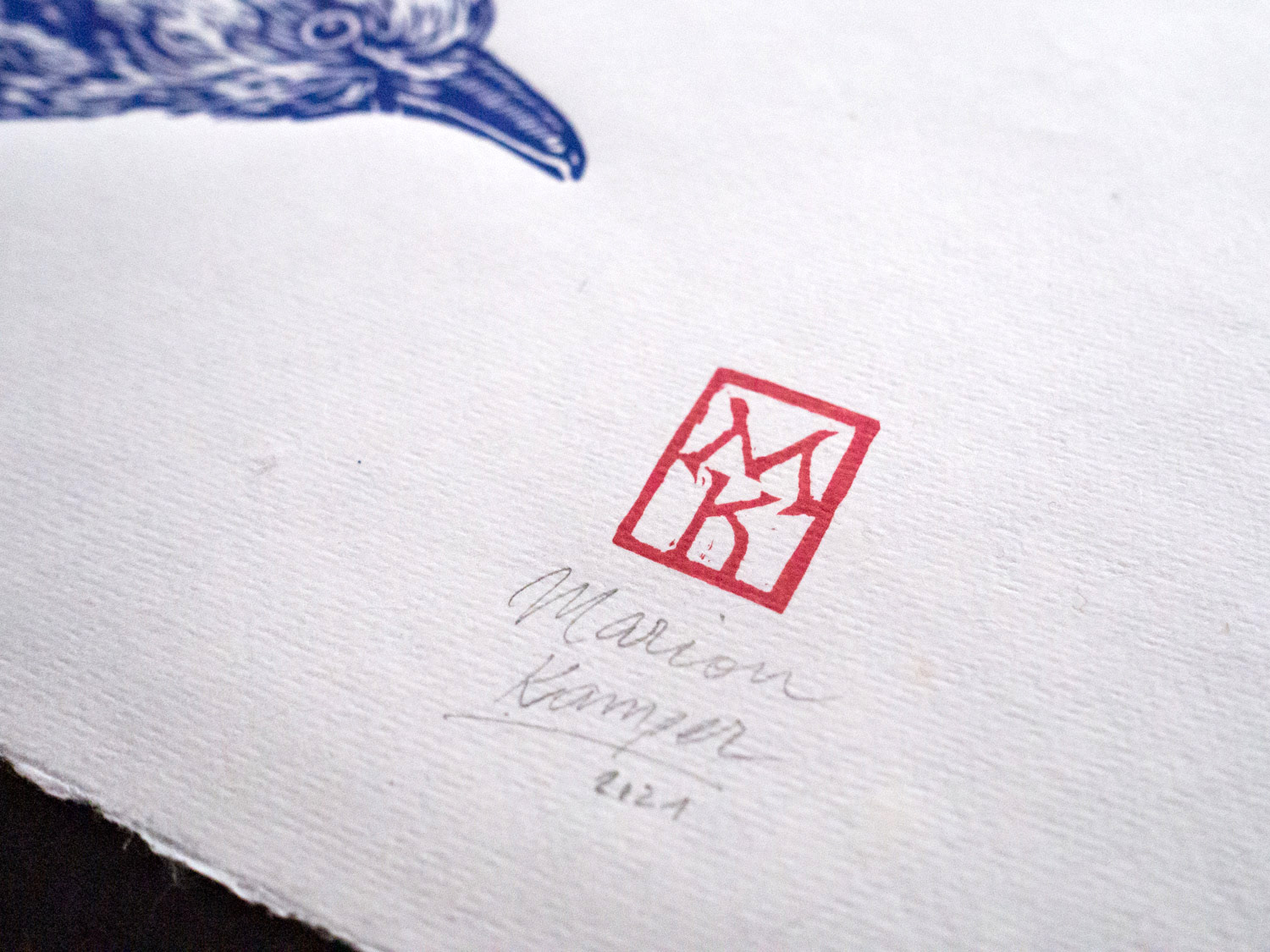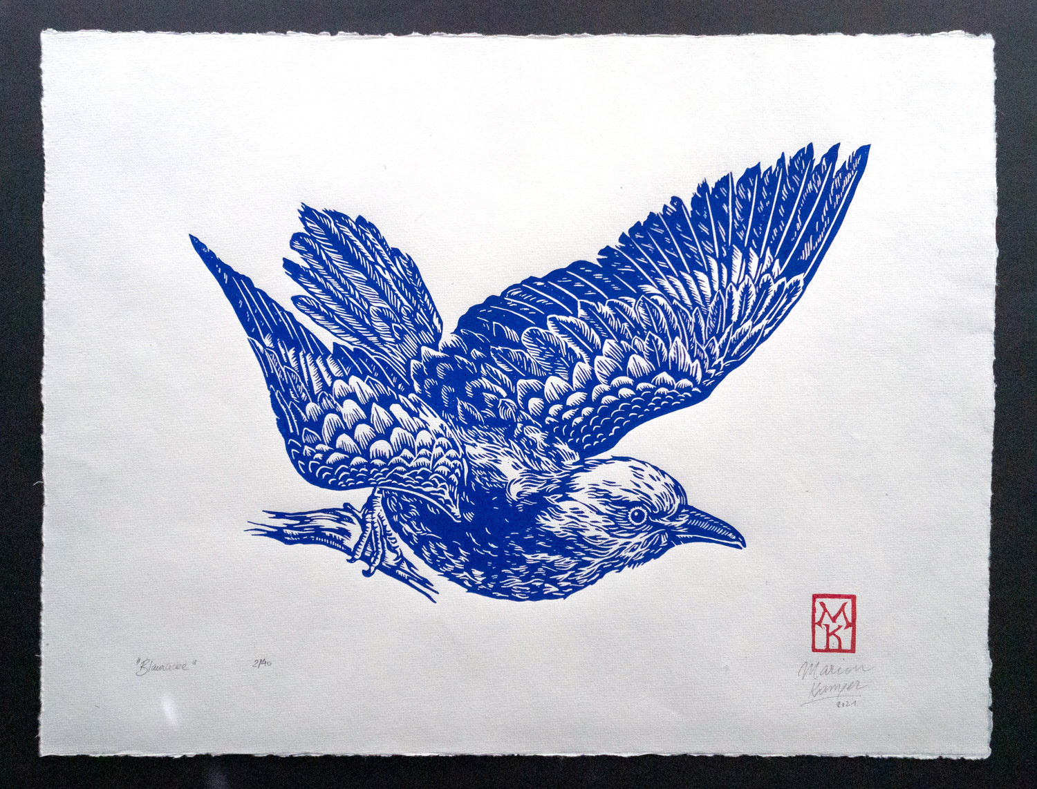 Linoprint of a blue roller (Blauracke), hand carved and hand printed. Stamped with a hand-carved monogram stamp in red on the front, signed and numbered limited edition of 40 pieces per color. Paper size 30,5 x 40 cm with deckled edges, slighty textured paper.