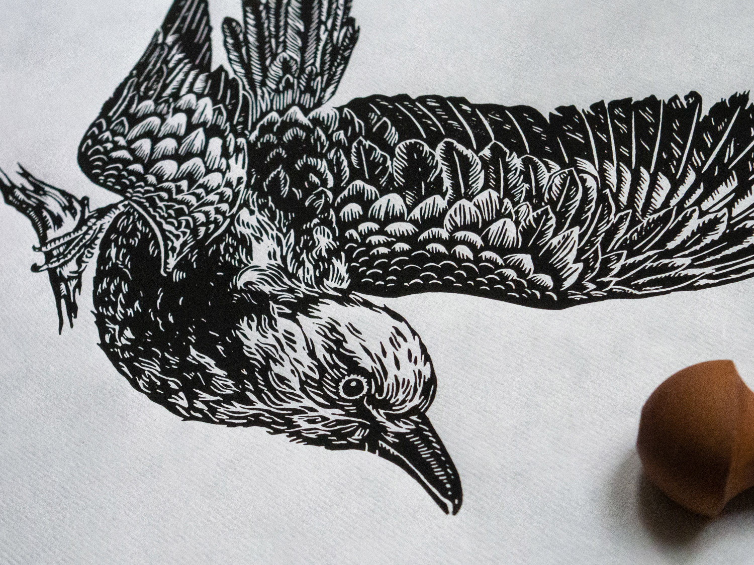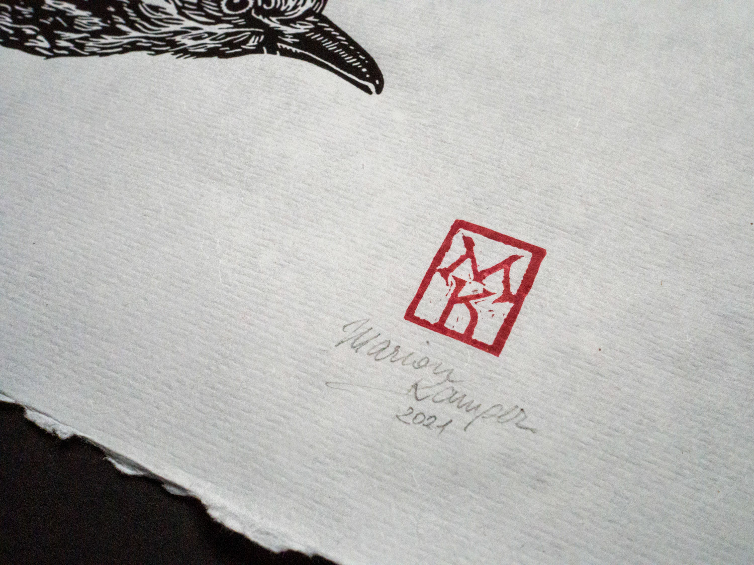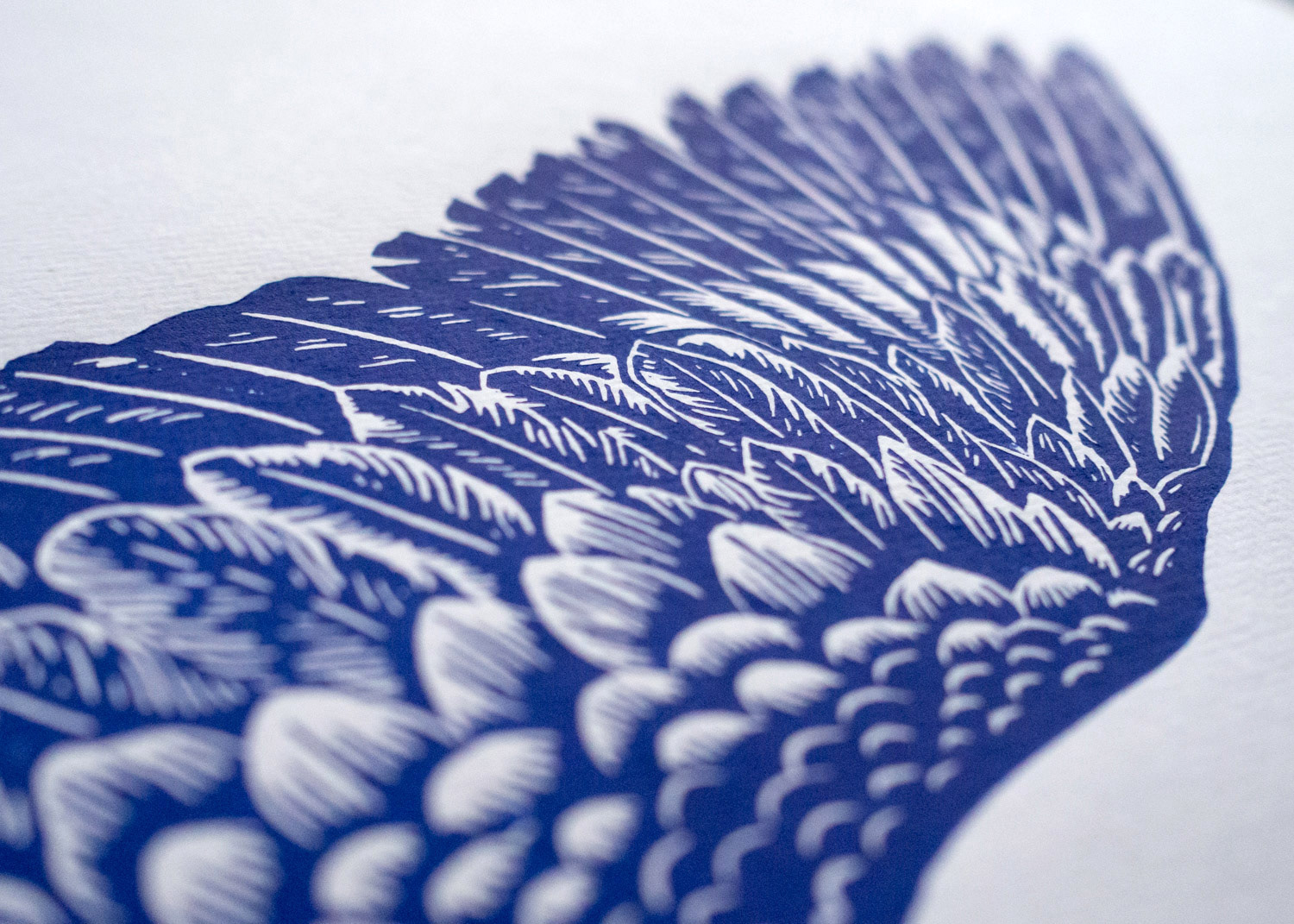 Linoprint of a blue roller (Blauracke), hand carved and hand printed. Stamped with a hand-carved monogram stamp in red on the front, signed and numbered limited edition of 40 pieces per color. Paper size 30,5 x 40 cm with deckled edges, slighty textured paper.