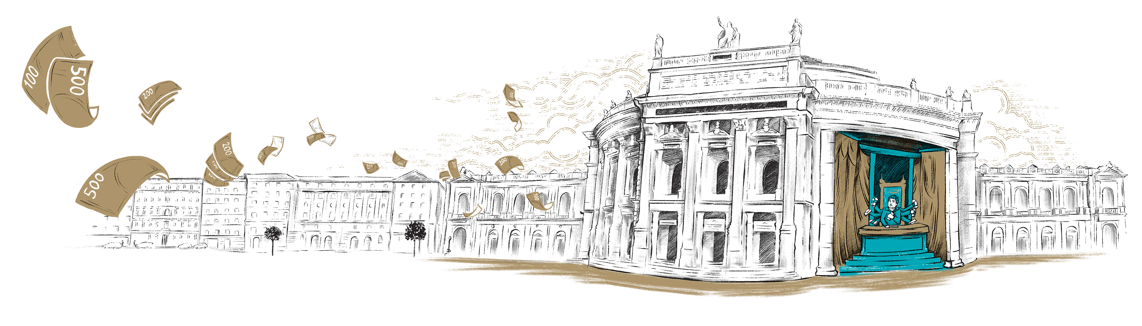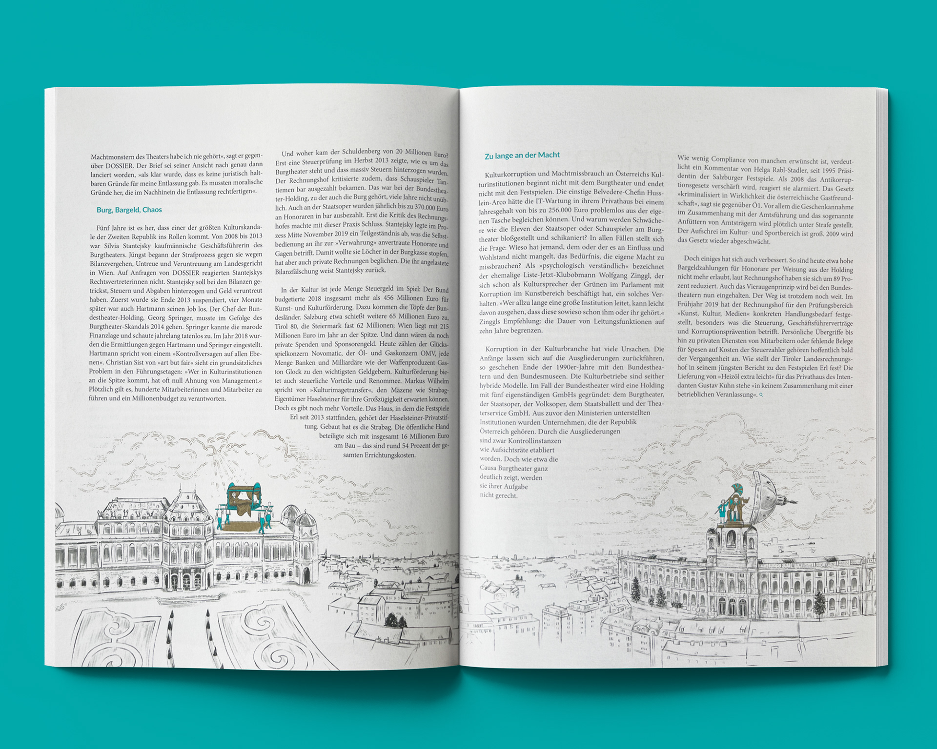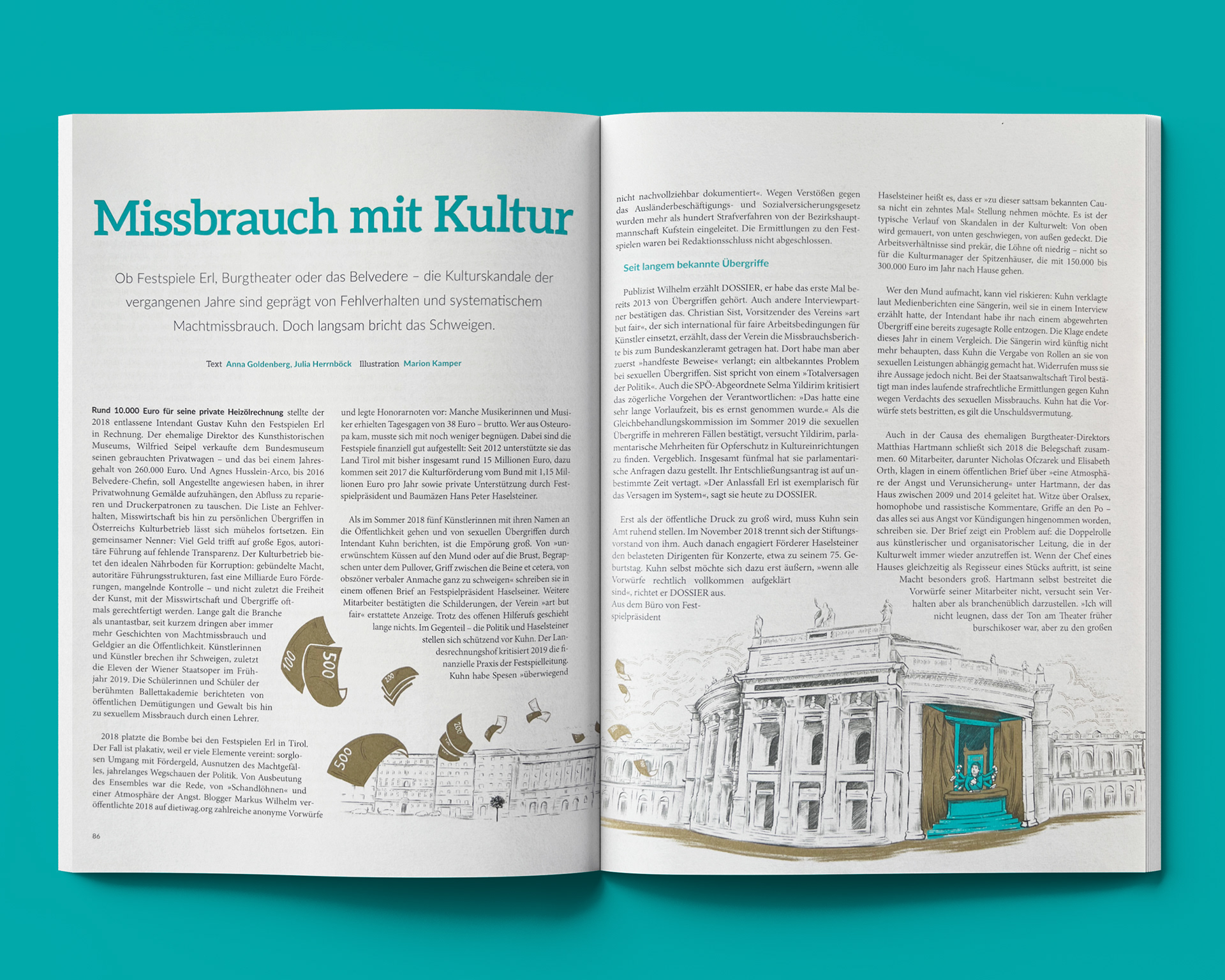 Artwork for 'Missbrauch mit Kultur' in DOSSIER magazine. The article is about several scandals and abuse of power in Viennese cultural institutions. I depicted the three key players in their respective work places Belvedere, Burgtheater and Kunsthistorisches Museum Wien embedded in a skyline of Vienna on a four page spread.